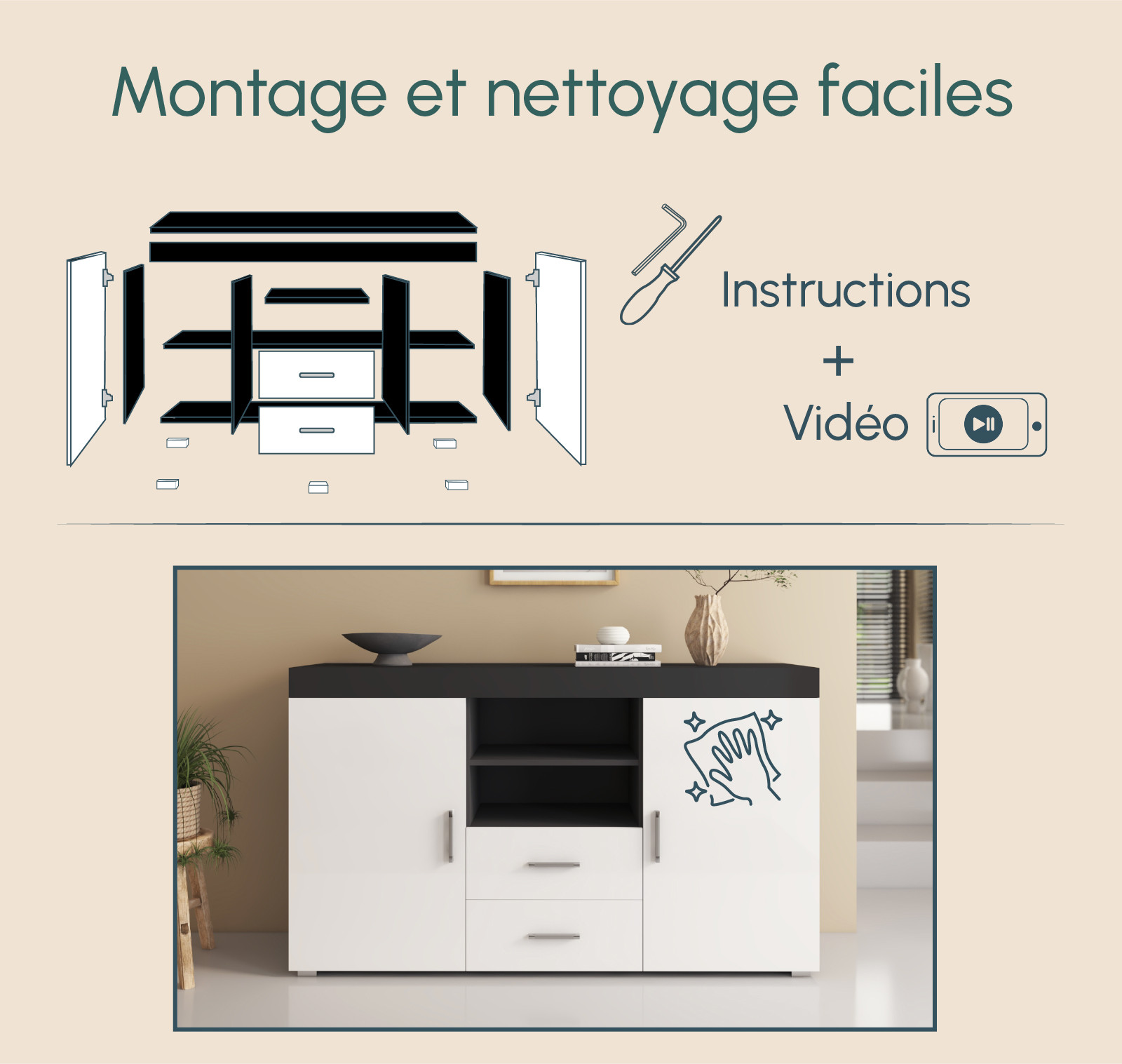 Le meuble est livré démonté avec la visserie et la notice pour un montage facile (aucun outil spécial n'est nécessaire)