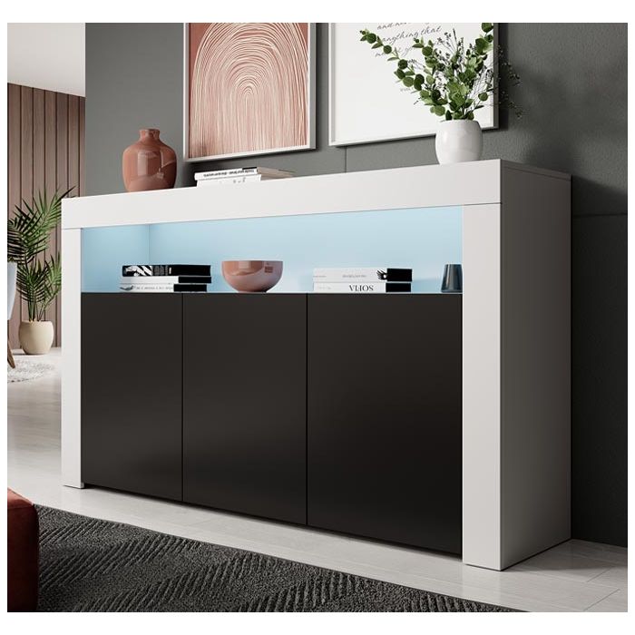Buffet moderne au design rectiligne, finitions mates et lumière Led. Idéal pour créer une atmosphère chaleureuse et donner à votre salon une touche moderne. C'est un meuble très polyvalent qui peut être utilisé dans n'importe quel coin de la maison.